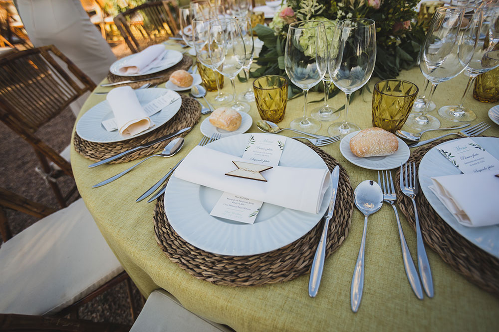 Todo estaba cuidado hasta el último detalle en cuanto a elección de manteles, vajilla, copas, centros de mesa… haciendo un conjunto en la misma gama y estilo de toda la boda.