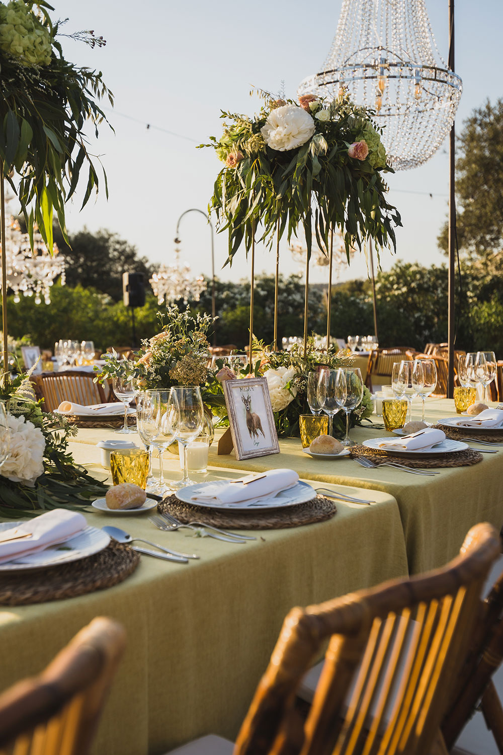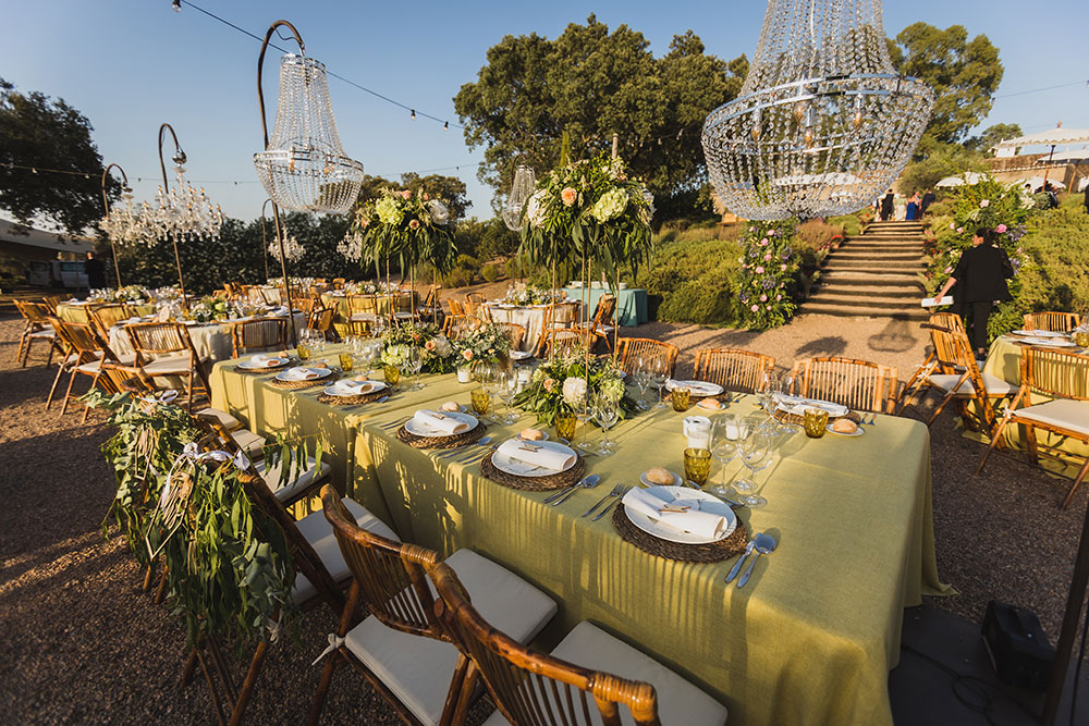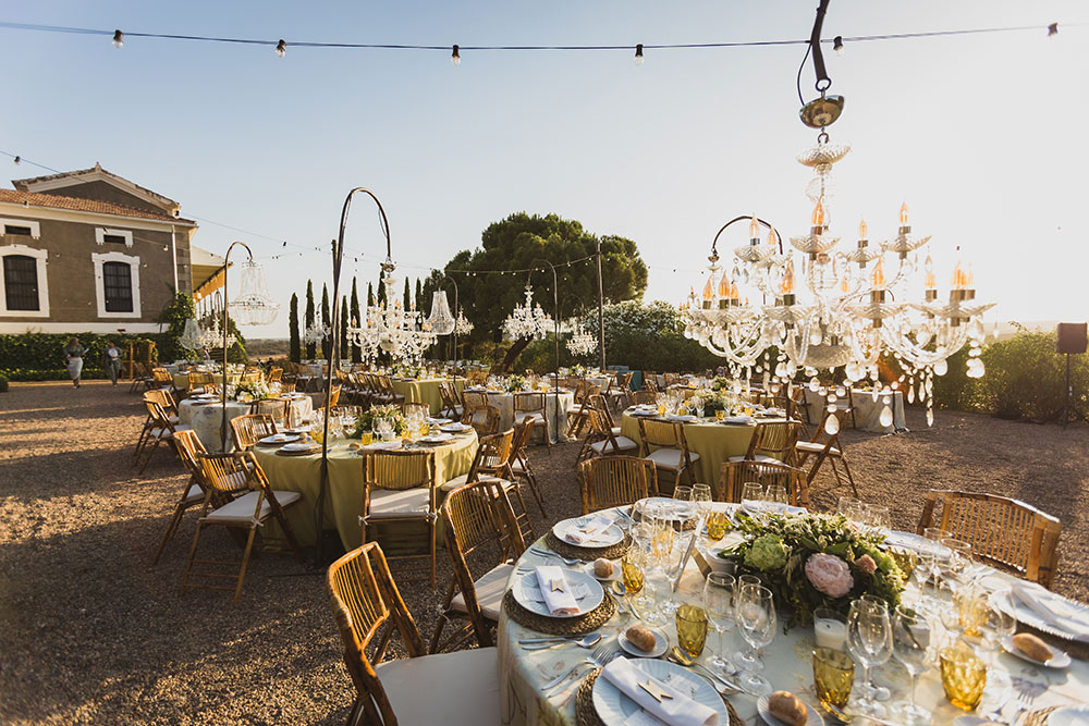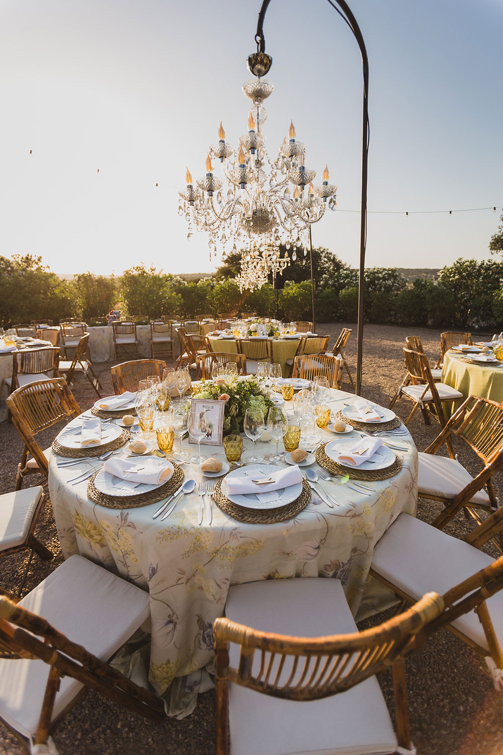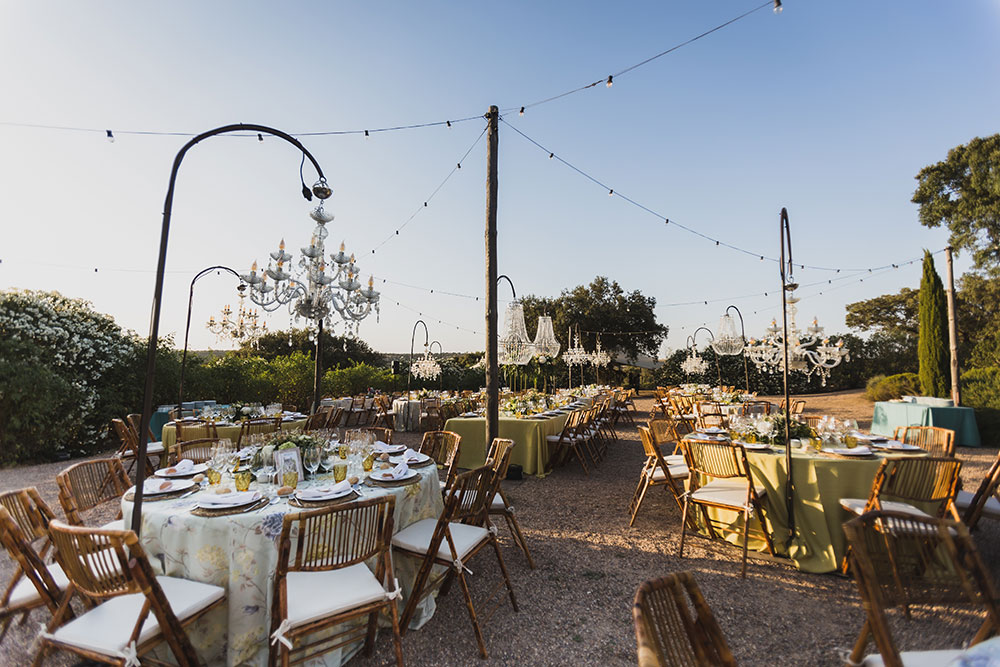 La iluminación, algo fundamental para nosotras resultó fantástica con lámparas chandelier en cada mesa, así como árboles iluminados y también el fondo del campo.